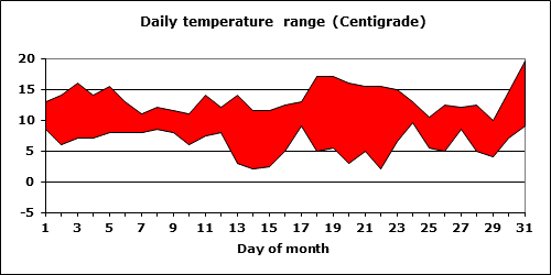 The day-time temperatures fluctuated between mild and fairly warm while the nights were regularly fairly cold but never freezing. However on the last day of the month, we had a rather strange but very welcome hot spell in the middle of the day.