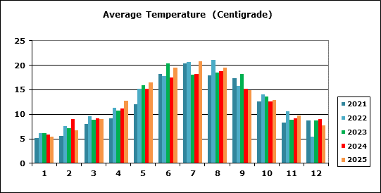 | Average over last decade 12.52C | Average over last decade 1357.3mm |